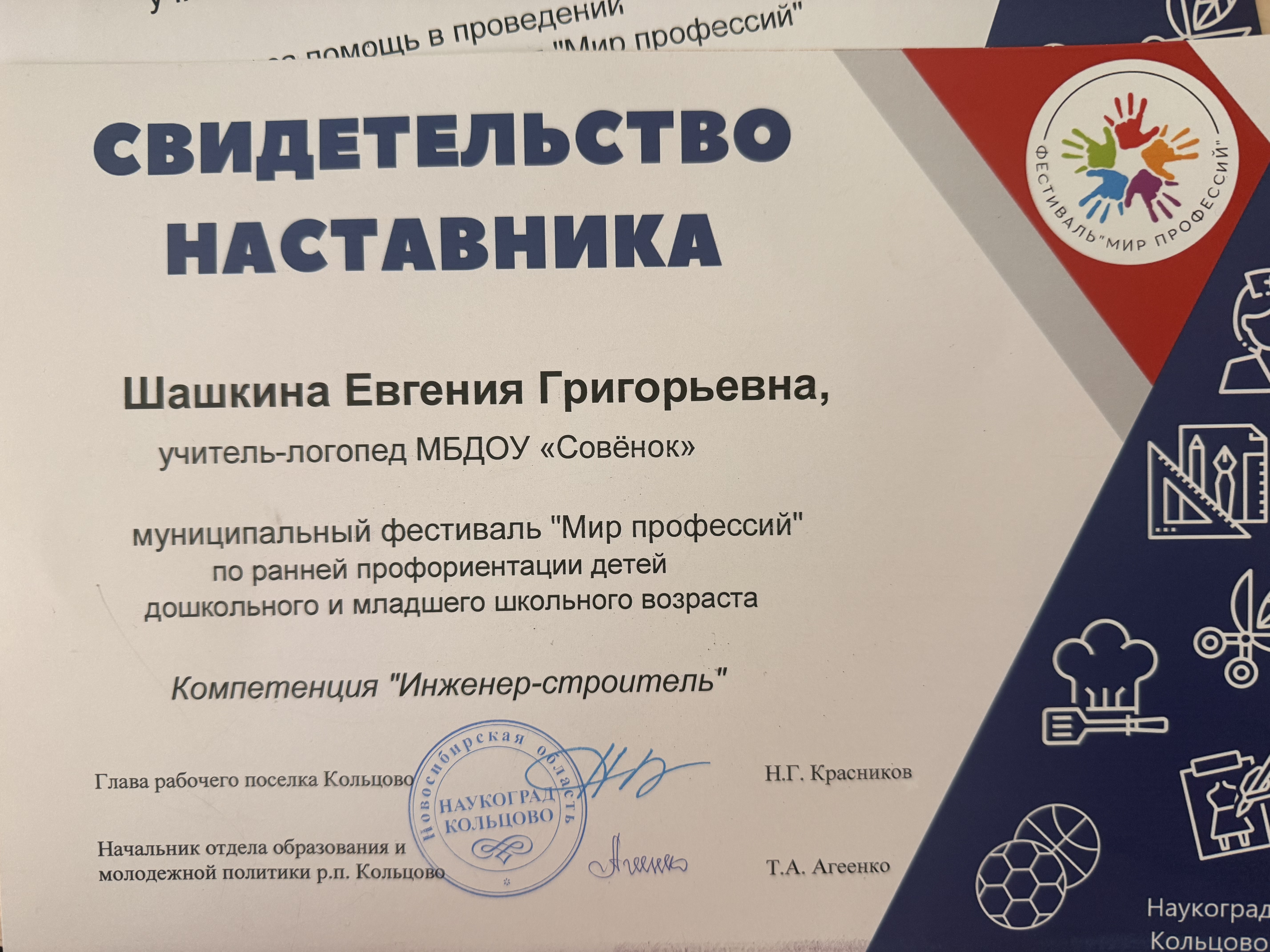 Свидетельство наставника " Мир профессий" 2026 г.